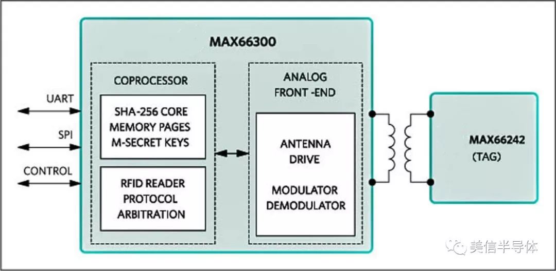 Maxim also offers the MAX66300 DeepCover Contactless Host Security Authenticator, which includes an RFID transceiver and a SHA-256 Secure Authenticator coprocessor. It provides four pages of 32-byte user memory, four master keys, multiple programmable protections, 76-byte SRAM, a hardware true random number generator, and a unique 64-bit serial number.